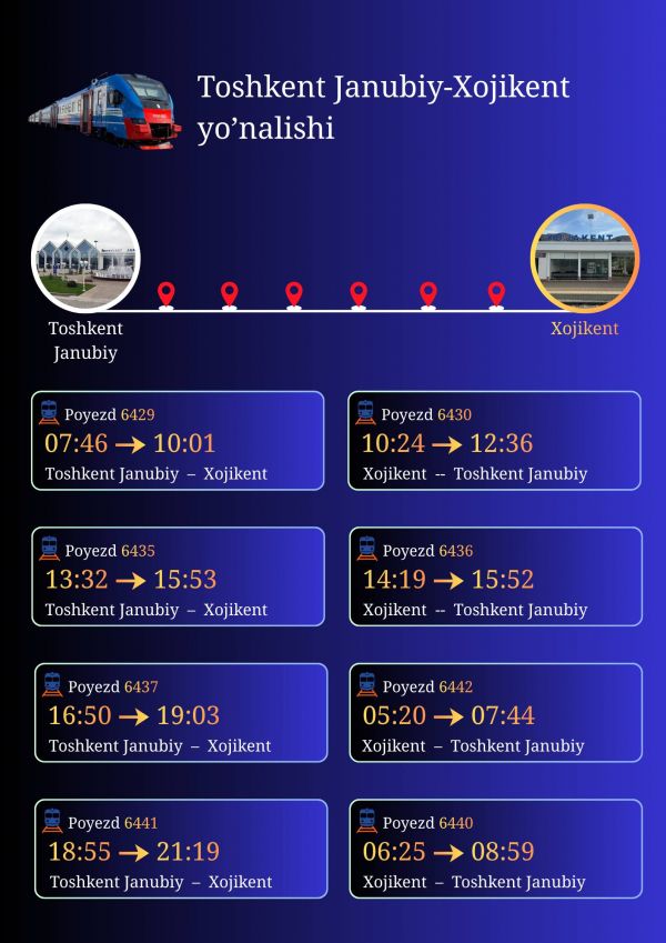 Toshkent viloyatida shahar atrofidagi temir yo‘l yo‘lovchi tashuvlarini yo‘lovchilarning qulayligi va xavfsizligiga e’tibor qaratgan holda ta’minlaydi.
