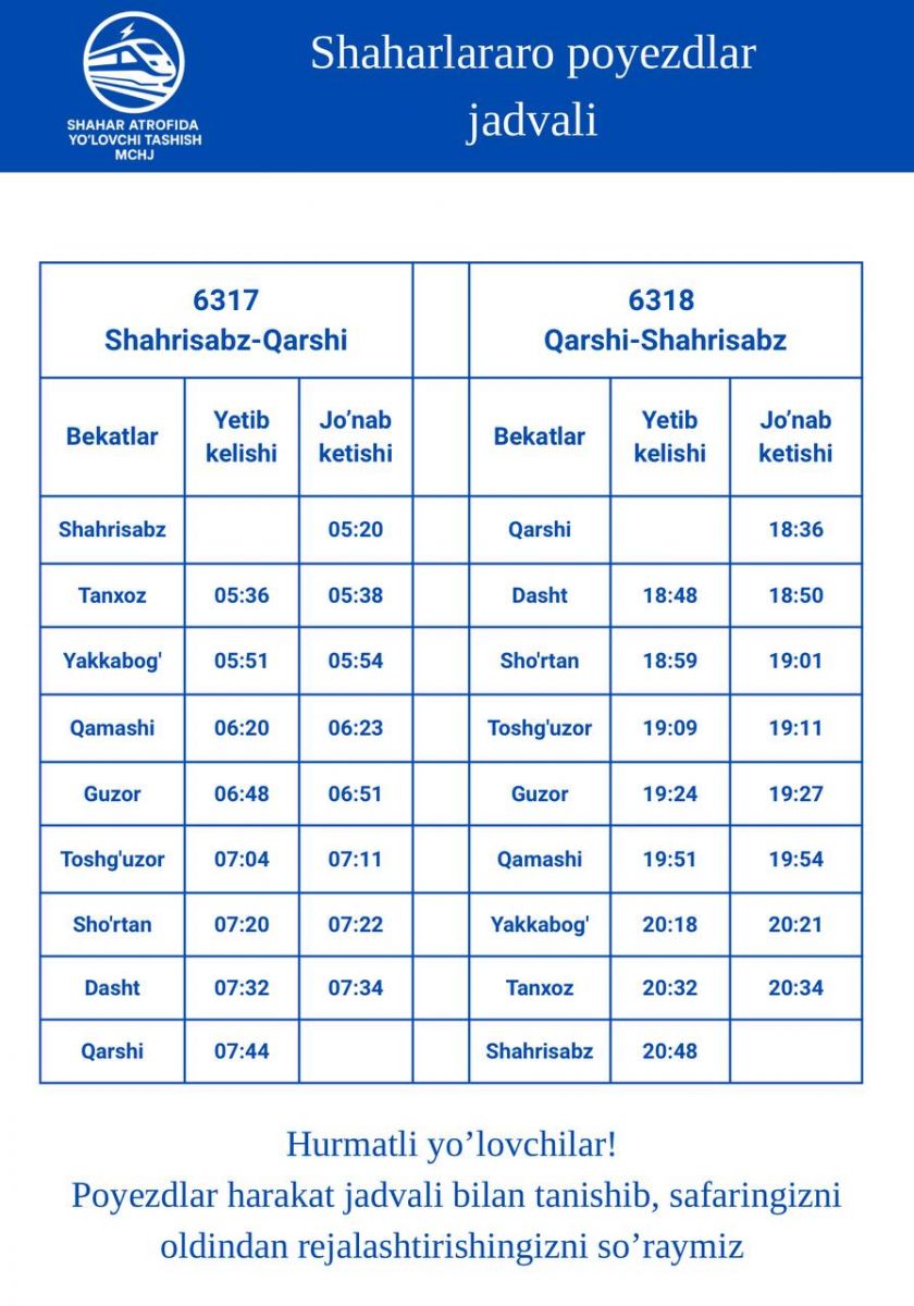 🚆Qashqadaryo shaharlararo poyezdlar harakat jadvali bilan tanishib, safaringizni shaharlararo poyezdda rejalashtiring. Sizga qulay va xavfsiz safar tilaymiz!